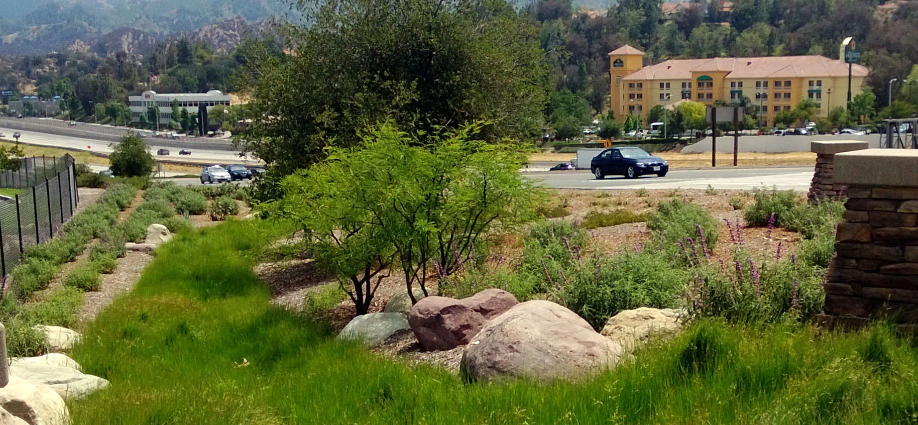 The rolling hills and native plantings around the Lyons Avenue / I-5 interchange are among the most beautiful natural areas in the City of Santa Clarita. This character guided a landscape design that relies on native plants and natural landforms.